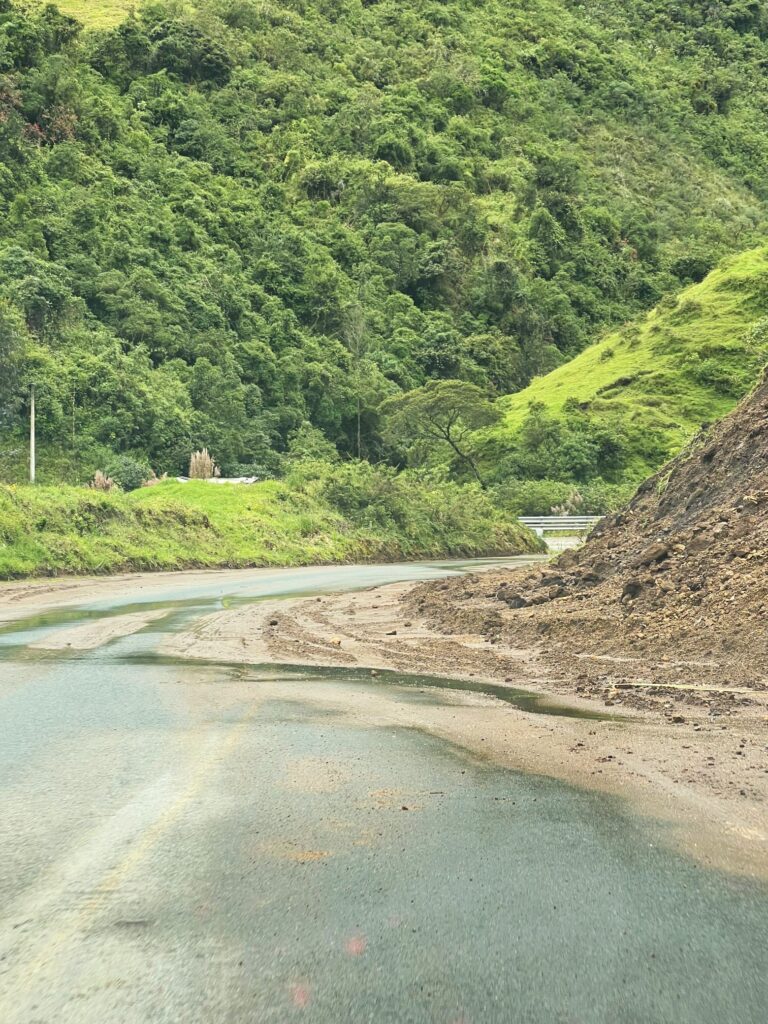 El último gran problema en relación con las carreteras al que uno se enfrenta conduciendo en Ecuador son los derrumbamientos o desprendimientos. Las vías están construidas en las laderas de las montañas y colinas. Si juntas eso con que no hay protección y con la intensa lluvia, tienes grandes porciones de tierra que se derrumban constantemente, llevándose consigo árboles o rocas. Nosotros no vimos ninguno en directo, pero sí que nos topamos con carreteras en las que un carril estaba ocupado por un árbol. La parte buena es que no dimos con ninguna vía colapsada por este motivo. De nuevo, ir despacito para poder esquivar lo que venga es la mejor solución.