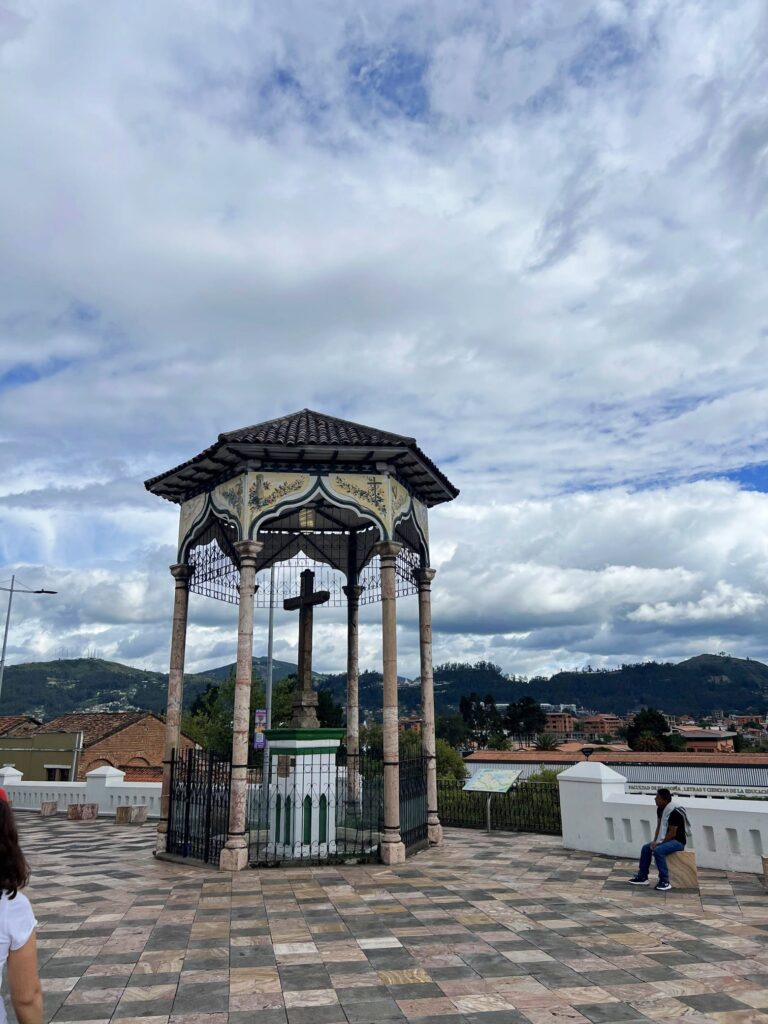 Abandonamos el paseo del río para subir a empezar a conocer el centro histórico de Cuenca. Lo primero con lo que nos topamos fue con la Plazoleta Cruz del Vado. Allí hay una cruz de mármol que reemplazó a la original de madera, y que sirvió durante la fundación colonial para marcar los límites de la ciudad. Además, como curiosidad, se dice que protege a los cuencanos de las crecidas del río.