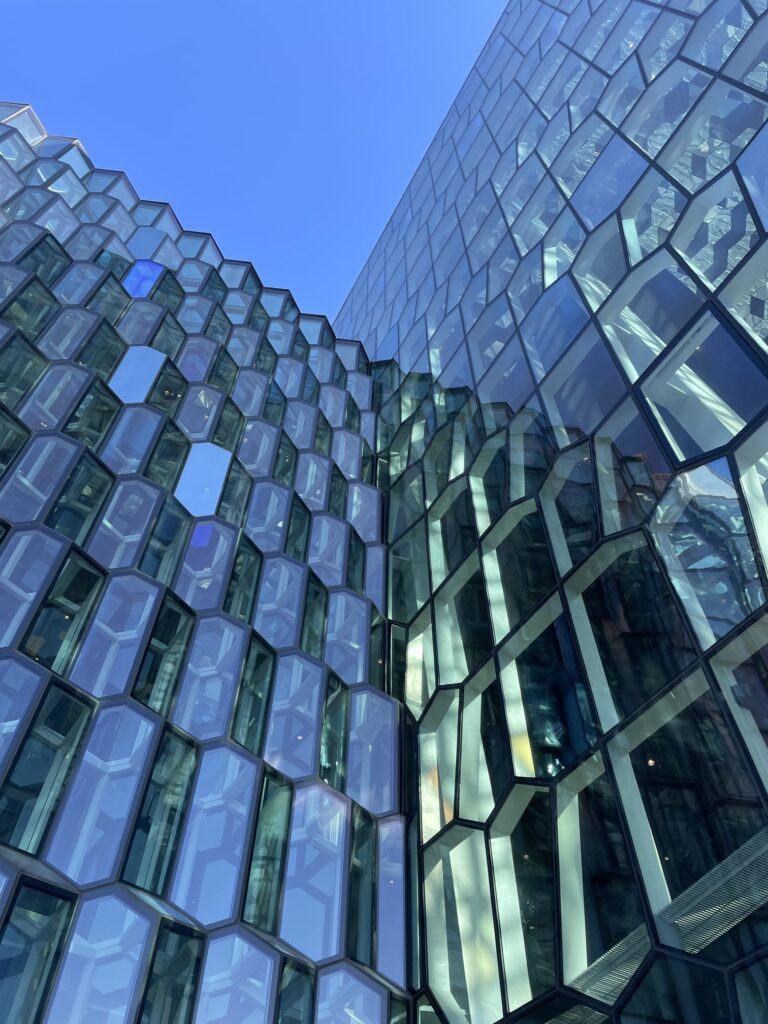 Lo más característico es su fachada exterior, inspirada en los basaltos hexagonales que caracterizan el paisaje islandés. Para recrearlos, se utilizaron paneles de vidrio y acero que reflejan la luz natural. Además, están colocados en diferentes ángulos, lo que, junto al movimiento del sol, hace que cambie totalmente de color dependiendo de la perspectiva o momento del día que lo visites. Muy curioso de ver la verdad. Por cierto, si te acercas por la noche, podrás disfrutar de otra imagen, la formada por el sistema LED integrado en los paneles que alumbran la fachada con distintos colores o motivos.