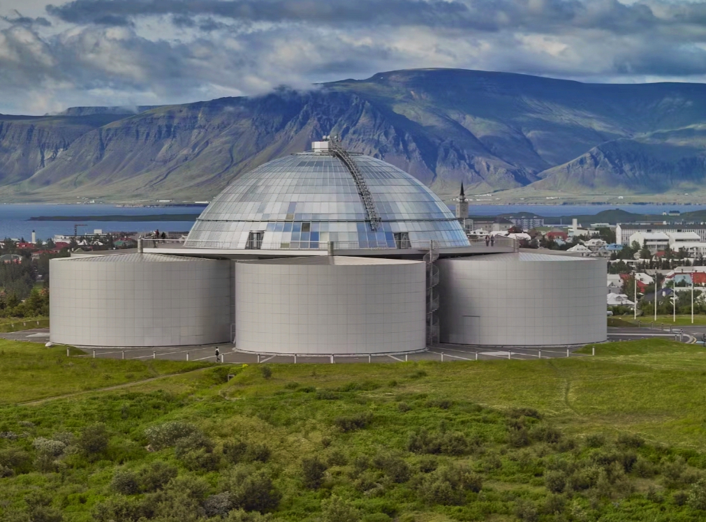 A las afueras de Reikiavik se ubica Perlan, uno de los edificios más emblemáticos y modernos de la capital, conocido por su distintivo diseño arquitectónico y sus vistas panorámicas de los alrededores.