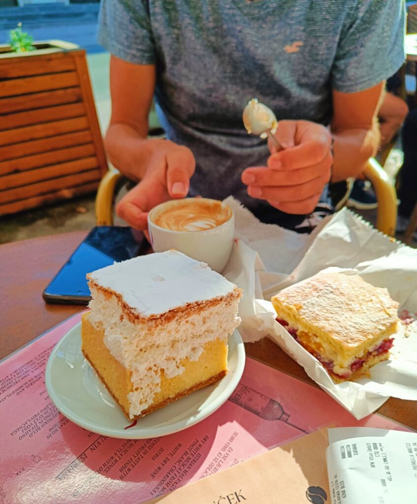 Por cierto, la región tiene un postre súper típico que verás en todos lados, el kremna rezina, una especie de milhojas de crema y nata. El primer imprescindible que hacer en Bled no puede ser otro más que probarlo! Nosotros lo hicimos para desayunar y estaba muy rico 🙂