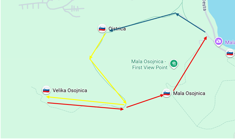El camino no tiene pérdida, aunque os dejamos abajo un mapa con la ruta a seguir para llegar a los tres miradores. El único sendero que no aparece en Google Maps es el que une Ojstrica y Mala Osojnica (aunque sí en Maps Me). Si vas a ver los tres, se suele empezar con Ojstrica. Desde allí tendrías que continuar el sendero hasta una bifurcación, en la que el camino que sale a la derecha llega a Velika Osojnica y el de la izquierda a Mala Osojnica.