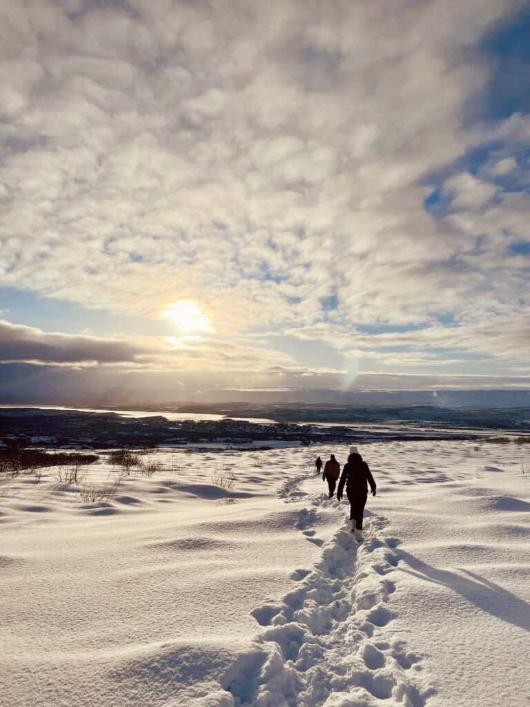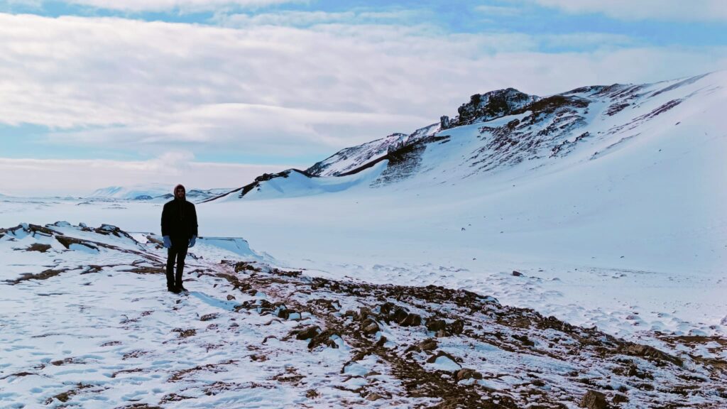 Una vez dejes el coche, tendrás que subir por un camino hasta la cima. Pese a que no es largo, unos 15-20 minutos, se hizo durillo con la cantidad de nieve y hielo que había. Arriba te estará esperando una vista espectacular tanto del interior como de los alrededores. Puedes quedarte con eso o hacer una caminata circular por todo el exterior del cráter. Como completarla requiere de demasiado tiempo, calcula no menos de 1 hora y a muy buen ritmo, optamos por caminar unos 20 minutos hacia la derecha y dar media vuelta. Te recomiendo mucho que vayas en esa dirección si no tienes intención de completar el camino, ya que subirás un poco más y las vistas mejoran.