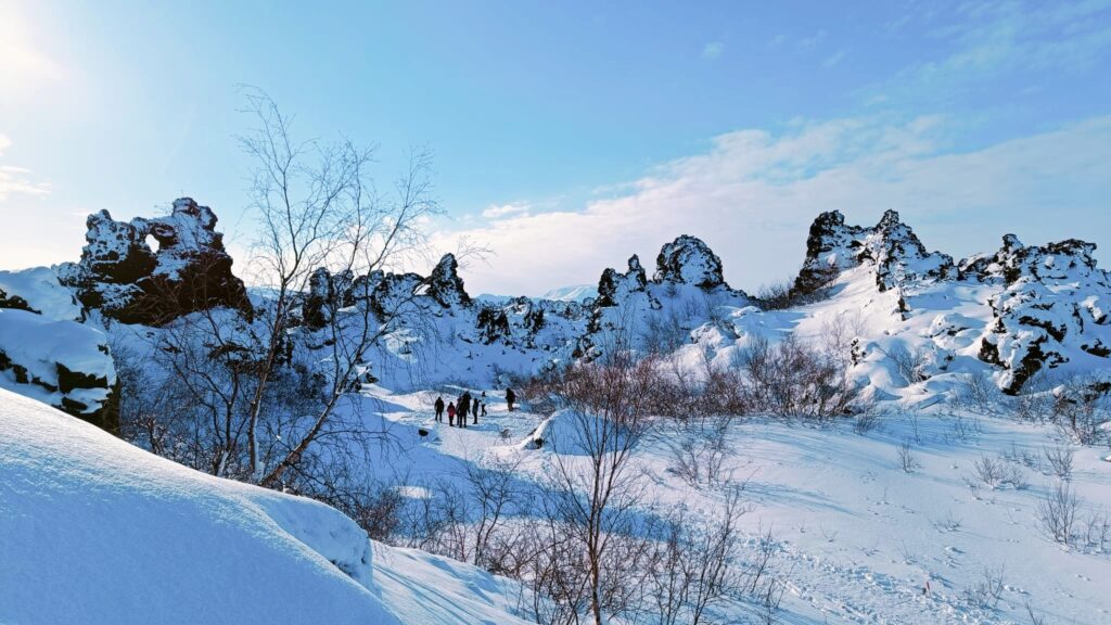 Dimmuborgir es una formación de lava única en el mundo, con estructuras rocosas que parecen castillos, columnas y cuevas, resultado de actividad volcánica ocurrida hace unos 2.300 años. Se cree que su formación tiene origen en una piscina de lava fundida que cubrió un área de agua, creando gruesas capas de vapor que causaron explosiones y moldearon estas figuras irregulares. Cuando la lava se enfrió, quedó lo que vemos hoy.
