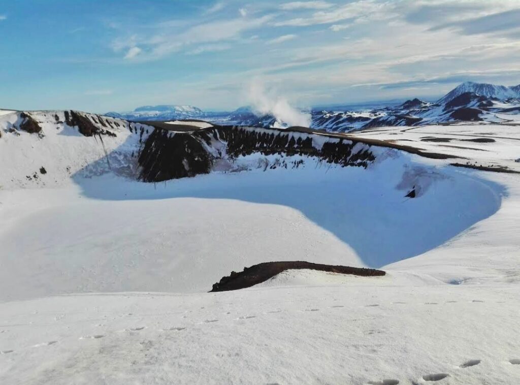 Uno de los lugares más destacados es el cráter Viti, cuyo nombre significa «infierno» en islandés, una referencia a las antiguas creencias de que los volcanes eran puertas al inframundo. Viti se formó tras una erupción en el siglo XVIII, y es famoso por albergar en su interior un lago de color azul turquesa rodeado de tierras teñidas por el azufre y otros minerales.