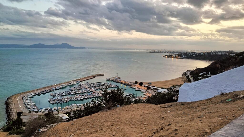 El puerto. Al fondo el monte/acantilado con Sidi Bou Said arriba.