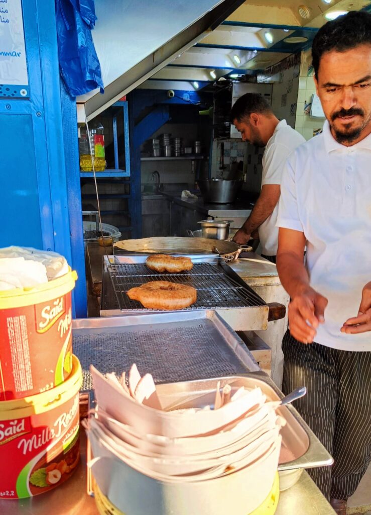 Empezamos el día en Ben Rahim, una cafetería a la entrada del centro. Sin duda y con muchísima diferencia, el mejor café que tomamos en todo el viaje. Tienen bollería muy rica también, 100% recomendado.