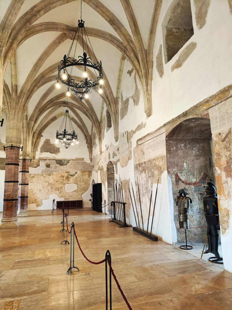 La visita nos encantó. Además de ser precioso por fuera, tiene tal cual la forma de un castillo de cuento, su interior esconde muchas sorpresas. Pasadizos, torres, capillas, miradores, pequeñas exposiciones, mazmorras con máquinas de tortura, un bonito patio interior…Sin duda, merece mucho la pena entrar a ver cómo vivía nuestro amigo Matías durante su reinado.