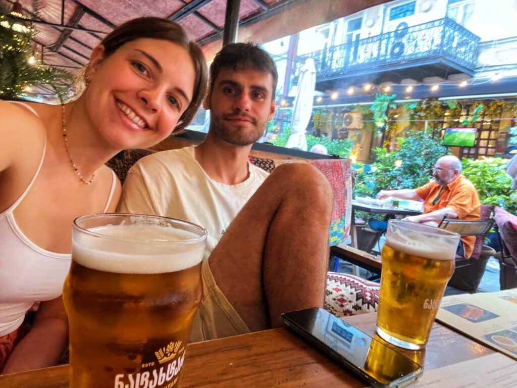 Llegamos a Tbilisi después de hacer una excursión de un día completo desde Ereván. Como ya era tarde, no nos dio tiempo a hacer mucho turismo. De hecho, nuestra visita a Georgia coincidió con la Eurocopa de 2024, y aquel día había partido de España, por lo que nuestras primeras horas en la capital del país consistieron en buscar un bar en el que verlo jaja Por cierto, de lo primero que vimos fue un bar español, el BCN Hispania, nada más cruzar el famoso Metekhi Bridge. Pero no hubo suerte, estaba completamente lleno, una pena porque vaya ambientazo!