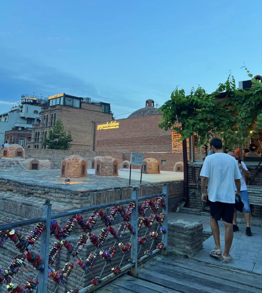Comenzaba a anochecer ya en Tbilisi y poníamos rumbo hacia la última visita del día, el barrio de Abanotubani. El nombre del barrio proviene de la palabra abanot, que significa «baño» en georgiano, y tubani, que significa «zona» o «distrito», lo que refleja la principal característica del lugar: los baños de azufre que se encuentran allí.