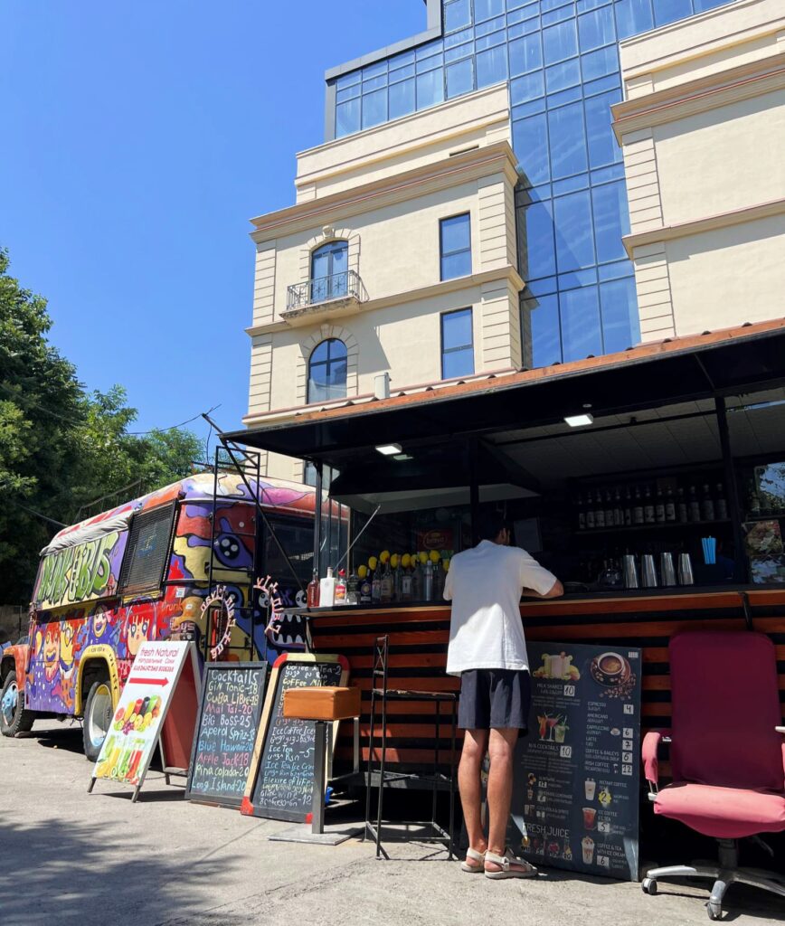 Nos planteamos comer en alguno de los puestos, pero, con el calor que hacía, creímos que nos sentaría mejor entrar a un restaurante con aire acondicionado. Estábamos en pleno julio y el termómetro alcanzaba ya los 38º. Nos acabamos sentando en Jazz Cafe Singer, donde pedimos lo más clásico de todo Georgia: un khachapuri y khinkalis. Siendo la primera comida en esta nueva aventura, ¡qué menos! Pagamos 20€ por los dos platos más bebida.