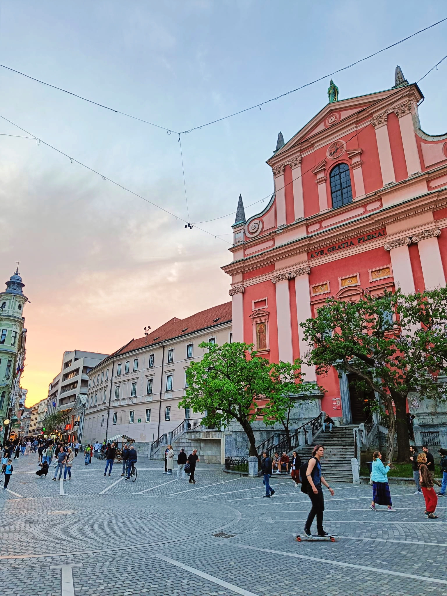 Lleva el nombre del poeta nacional France Prešeren, autor del himno de Eslovenia, cuya estatua preside la plaza. En uno de sus lados se encuentra la Iglesia Franciscana de la Anunciación, con su inconfundible fachada rosa: sin duda, el edificio más fotografiado de Liubliana. Además, tiene una peculiaridad hablando de Eslovenia, ¡es gratis! Así que no se te olvide entrar a echarle un vistazo. Nosotros casi nos quedamos sin verla porque nos parecía que estaba cerrada.