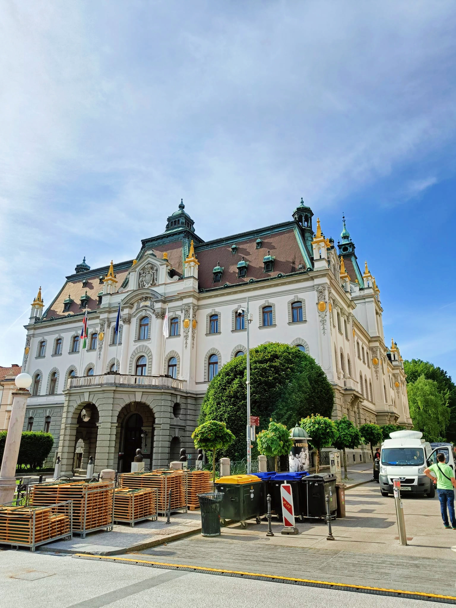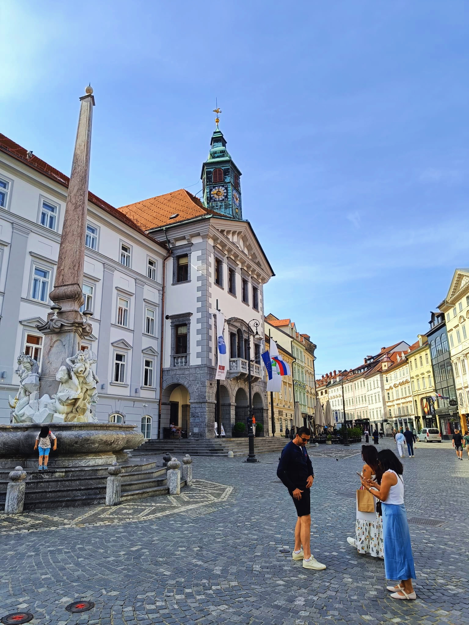 Lo mejor de la plaza son los edificios que la rodean. Tan elegantes como bonitos, nos quedaríamos con tres por encima del resto: el Palacio de la Filarmónica, uno de los auditorios más antiguos de Europa, la Iglesia de la Santísima Trinidad y la sede de la Universidad de Liubliana, donde se ubica el rectorado hoy en día. Además, la vista del Palacio de la Filarmónica con el castillo de fondo nos pareció preciosa.