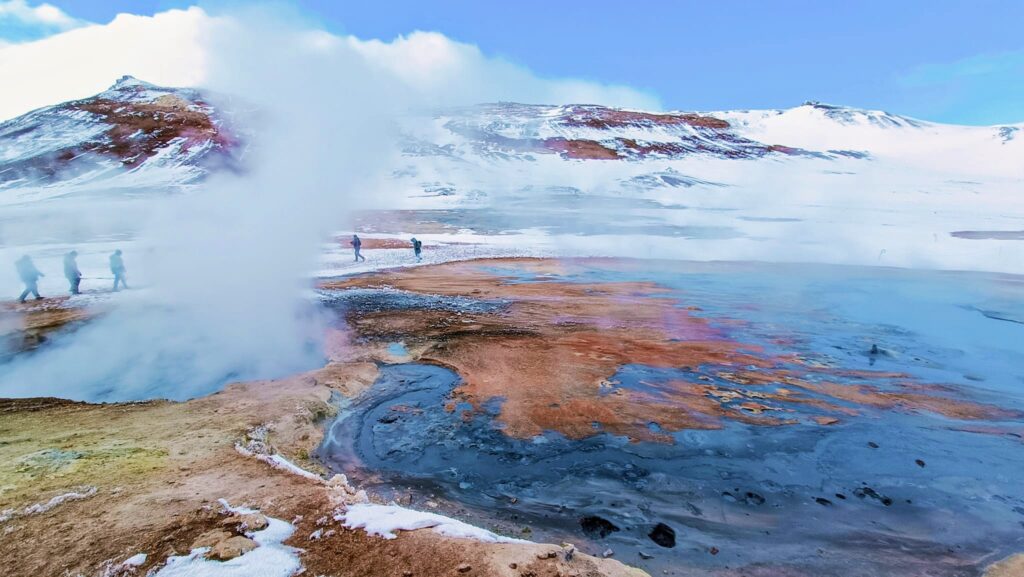 Al oeste, puedes visitar Dimmuborgir, un laberinto de formaciones de lava con estructuras fascinantes que parecen castillos y cuevas. A poca distancia, se encuentra Hverfjall, un imponente cráter volcánico que ofrece vistas panorámicas inigualables a quienes se aventuran a subirlo. Al lado está Hverir, un área geotérmica cercana al paso de Námafjall, famosa por sus humeantes fumarolas, pozas de barro burbujeante y un paisaje surrealista teñido de tonos amarillos, naranjas y grises debido a los depósitos de azufre.