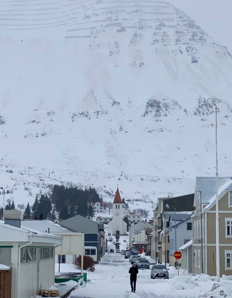 Lo más bonito del pueblo es que está rodeado por imponentes montañas. Por ejemplo, la vista desde la calle Adalgata hacia la iglesia Siglufjardarkirkja con la pared de roca detrás me pareció preciosa. También merece mucho la pena acercarse a la orilla del fiordo y al puerto, desde donde se aprecia perfectamente todo el entrante de agua entre el accidentado relieve de los alrededores.