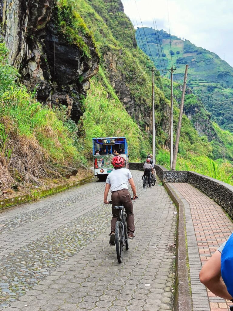 A no ser que seas un ciclista experimentado, hacer la Ruta de las Cascadas de Baños en bici quiere decir que harás la ida en bici, pero no la vuelta. Y es que el camino de ida es mayormente en bajada, con algún pequeño repecho, pero sin mucha dificultad. Como estamos seguros de que la mayoría no querrán ni plantearse la idea de regresar pedaleando, lo más habitual es subirte en la Cascada del Pailón del Diablo a un pequeño camión que te devolverá a Baños por 3$ por persona (bicicleta incluida por supuesto). Si llegas hasta la Cascada El Rocío Machay, sí que tendrás que deshacer en bici los 2 kilómetros que la separan del Pailón, ya que los camiones solo salen desde allí.