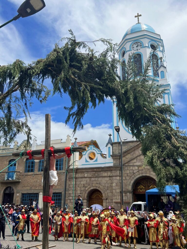 De camino puedes parar en el Complejo Arqueológico de Ingapirca. Nosotros nos lo saltamos pensando en hacerlo a la vuelta, pero al final ni una cosa ni la otra. Lo que sí que hicimos fuera una breve parada en Tambo. Y es que nuestro viaje en Ecuador en 12 días coincidió con la semana santa, y nos topamos con una curiosa representación de la crucifixión de Cristo. La verdad que los disfraces mejorables eso sí jaja