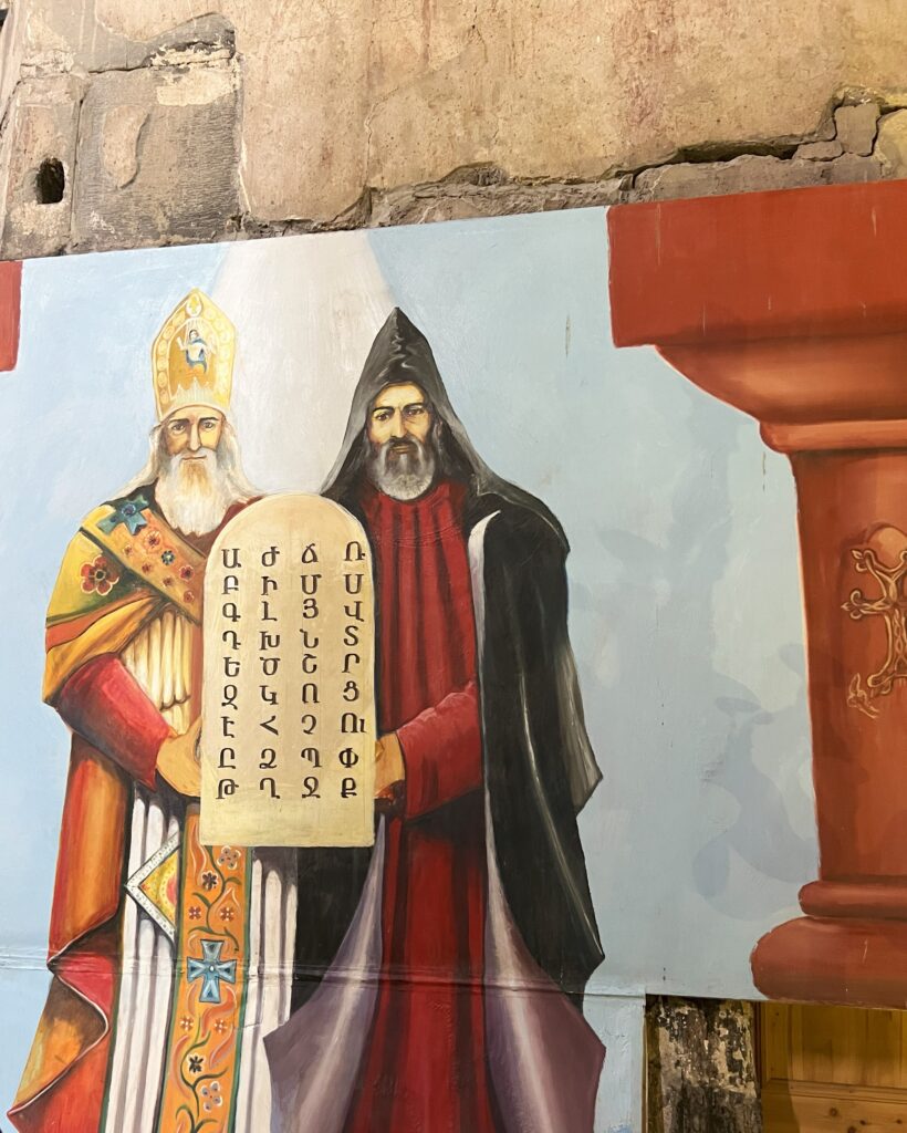 En Armenia se habla armenio. Es una lengua única dentro de la familia de lenguas indoeuropeas. A diferencia de otros idiomas de la región, no tiene una relación cercana con el georgiano ni con las lenguas túrquicas de Azerbaiyán. Uno de los aspectos más fascinantes del idioma es su alfabeto, que fue creado en el año 405 d.C. por Mesrop Mashtots, un monje y lingüista que buscaba dotar al pueblo armenio de un sistema de escritura propio para traducir textos religiosos y preservar su identidad cultural. El alfabeto armenio tiene 39 letras y es completamente único, sin relación con los alfabetos latinos, cirílicos o árabes. Así que, como supondrás, es imposible ni entender nada ni comunicarse con ellos en su idioma.