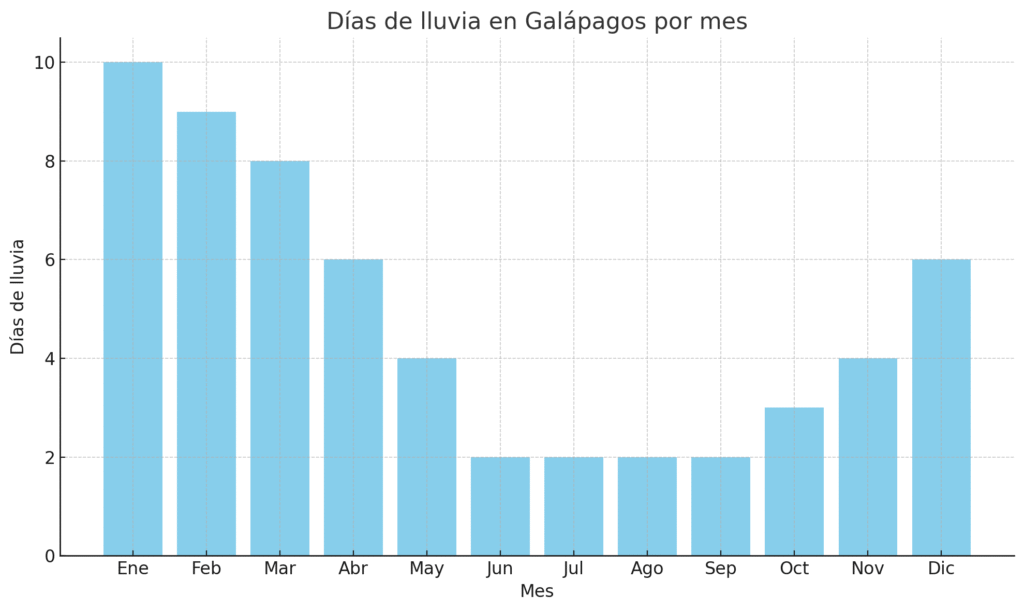 Como lógicamente es imposible saber qué tiempo va a hacer, al menos recomendaríamos tener en cuenta la probabilidad de lluvia en Galápagos en los días en lo que irías. Por aquí abajo te dejamos los días de lluvia esperados en cada mes.