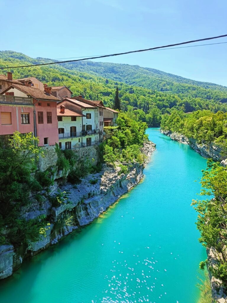 Una cosa buena de entrar al país por la carretera que lo hicimos nosotros, y no más al norte, es que este tramo a orillas del río Isonzo es precioso. Es increíble el color del agua en toda esta zona de Eslovenia, de cuento.