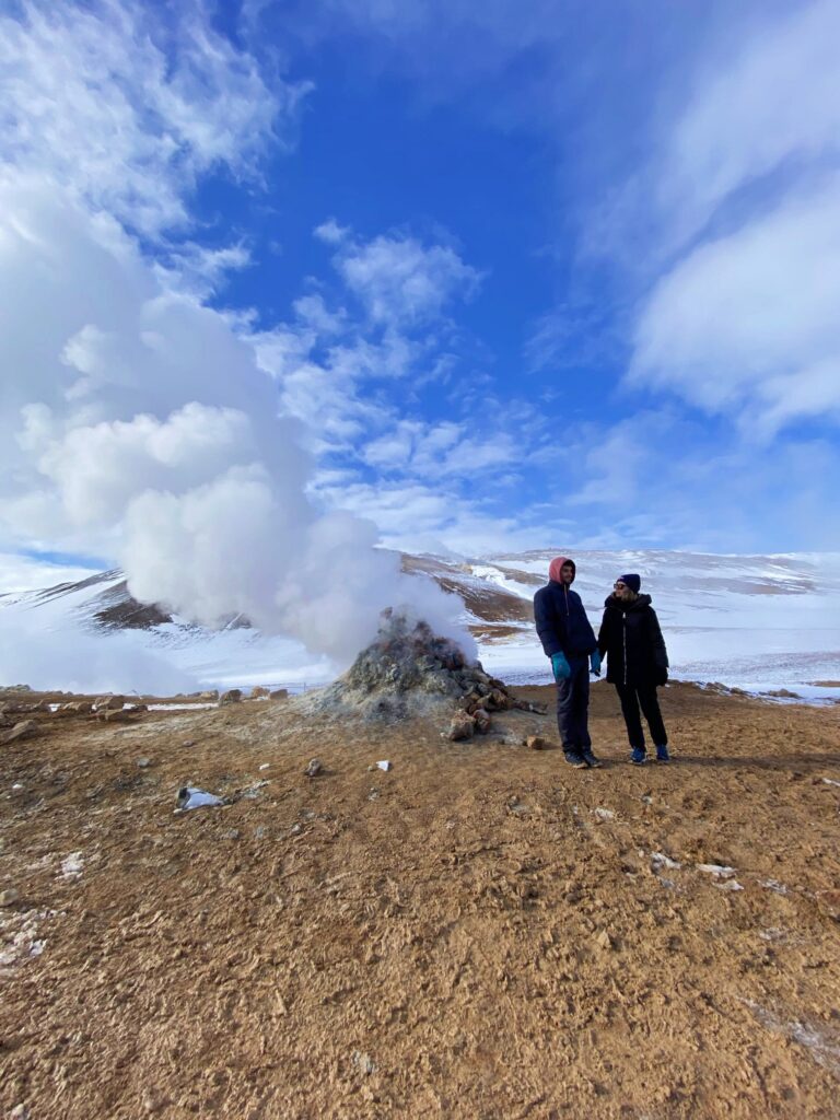 Hverir es una fascinante zona geotérmica conocida por su paisaje extraterrestre. Ubicado a los pies del monte Námafjall, parece sacado de otro planeta, con fumarolas humeantes, pozas de lodo burbujeante y un terreno teñido de colores amarillos, rojos y marrones debido a la presencia de minerales como el azufre y el hierro. Por cierto, la carretera para llegar atraviesa el monte Námafjall dejando bonitas vistas. De hecho, hay algún mirador desde el que podrás ver Hverir desde arriba. Hay quién se aventura también a subirlo, aunque necesitarás de más tiempo. Estuvimos unos 20 minutos y regresamos a la carretera.