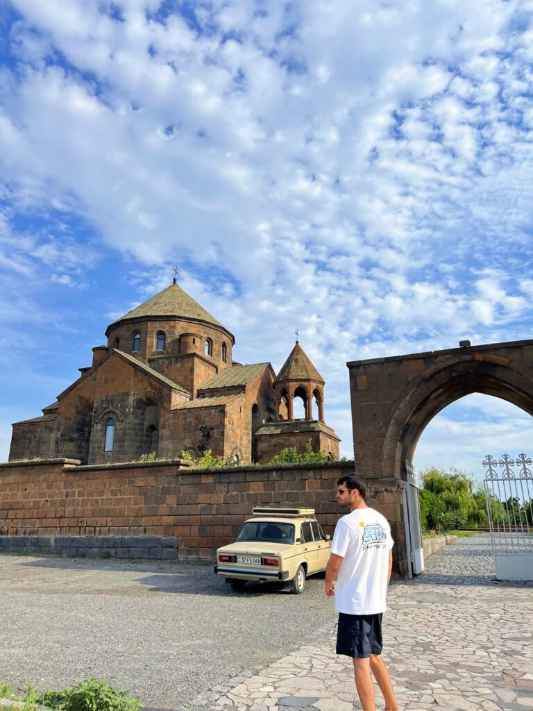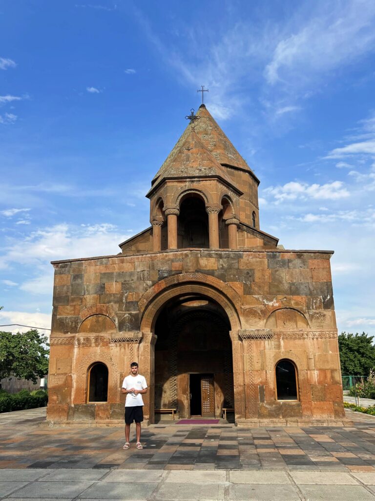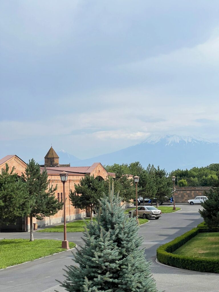 Respecto a la arquitectura, es un ejemplo clásico del estilo basilical armenio, con una estructura de piedra de tres naves y una cúpula central sostenida por cuatro columnas. Pese a que todo el complejo transmite mucha paz y calma, en los alrededores de esta iglesia fue donde más la sentimos. Con vistas a lo lejos al Monte Ararat, nos pareció un sitio espectacular. Muy cerca hay un antiguo cementerio al que merece la pena entrar, que cuenta con una preciosas vistas del monte con la iglesia delante. Además, las lápidas son súper antiguas y con diversos detalles, a los que te recomendamos echar un vistazo.