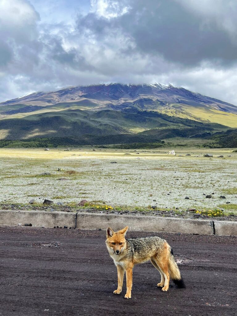 Lo que sí que vimos en este camino es un lobo del páramo o zorro colorado ecuatoriano, un cánido que habita en este tipo de lugares de América del Sur. Nos hizo mucha ilusión, aunque luego descubrimos que en la zona del aparcamiento del refugio es muy fácil verlos, ya que la gente les da comida y se han acostumbrado a esta forma fácil de conseguir alimento.